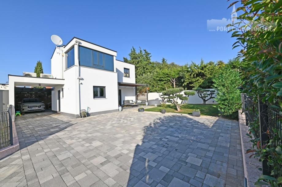 Na vanjskom dijelu kuće nalazi se portafonski sustav 2N Helios IP Base, sustav kliznih vrata KRONO, vanjska rasvjeta, sustav automatskog navodnjavanja, protuprovalni sustav sa sirenom te sustav videonadzora s pet vanjskih HIK VISION HD 4k kamera. Portafon i video nadzor su također pogodni za upravljanje putem pametnog telefona.