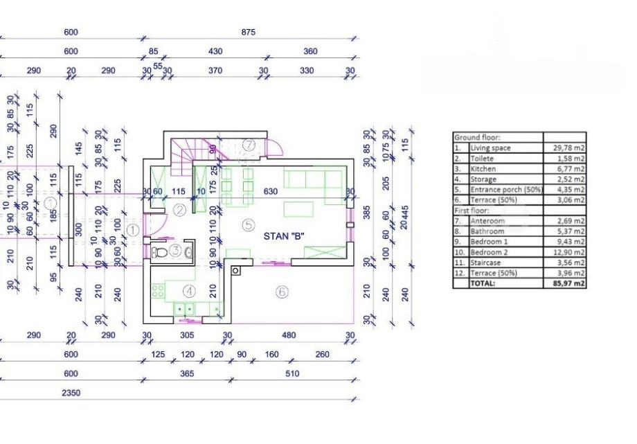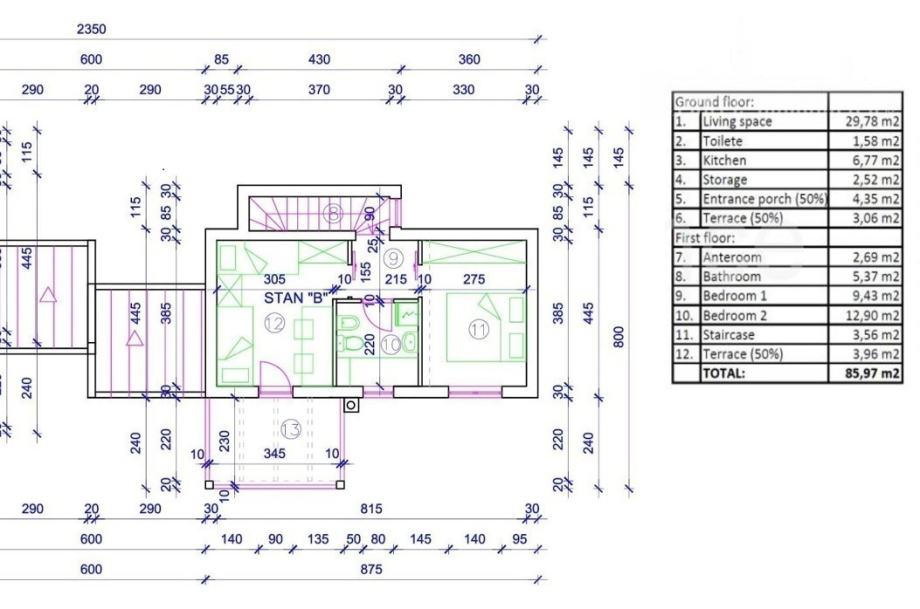 Kuća se sastoji od dvije etaže. U prizemlju, ulazni hodnik vodi u dnevni boravak, kuhinju i blagovaonicu. Dodatno, na ovoj etaži nalazi se mali wc i prostrana terasa. Na prvom katu nalaze se dvije spavaće sobe i kupaonica. Glavna spavaća soba ima garderobu/ormar koji je napravljen zatvaranjem balkona aluminijskim otvorima i staklenim stijenama.
