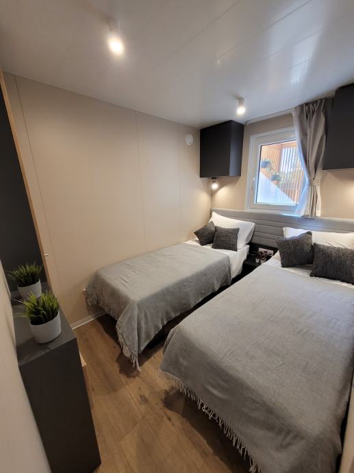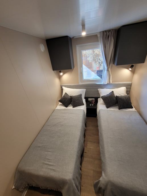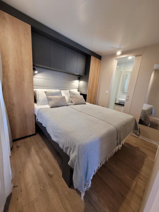Kapacitet je 4+2 osobe. Oprema: Vaillant Turbo mag 125/1 plinski bojler, fasada + HARD PVC,PVC klizna ulazna vrata, antracit izvana/bijelo iznutra, nasadna LED lampa dužinom pročelja,PVC antracit komarnici na prozorima, staklokeramička ploča za kuhanje 4 plin + zaštitno staklo 60 x 20 cm, samostojeći hladnjak inox boje, sa zamrzivačem, ugradbena kuhinjska napa 60 cm,inox sudoper s ocjeđivačem, perilica suđa 45 cm. 2 sobe: samostojeći i viseći ormarići sa zaokretnim frontama iznad kreveta s nadgradnom LED rasvjetom, povišeni krevet (35 cm) za pohranu prtljage, zaobljeni kutnici na rubovima kreveta, madraci džepičasta jezgra, visine 18 cm. Dimenzije kreveta master soba 160x200cm, dječja soba 2 kreveta 80x200cm + izvlačni kauč u boravku.Tapecirana uzglavlja master i dječje sobe.