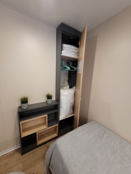 Mobilna kućica je kompletno opremljena i spremna za uporabu. Uz nju dolaze setovi posteljine, madraci, navlake, jastuci, pribor za jelo, tanjuri, zdjele, svi aparati, mikrovalna pećnica, namještaj na terasi je također uključen u cijenu.