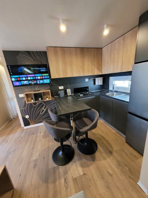 DNEVNI BORAVAK:Izvlačni trosjed, skidive i perive navlake madraca, forex dekoracija na zidu, pozicija prema nacrtu, šank/stol s 4 tapecirane polubarske stolice. Priprema za TV, WLAN, SAT u dnevnom boravku + TV