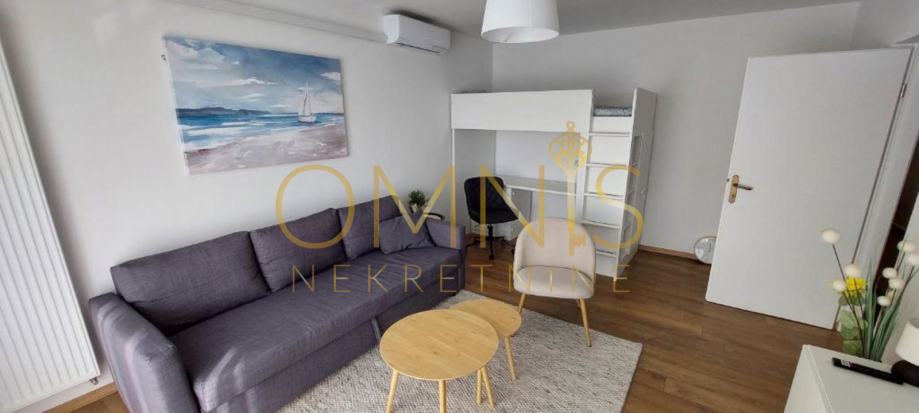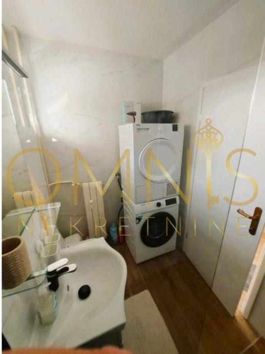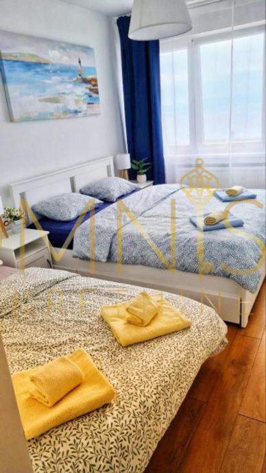 Stan je u potpunosti namješten i sastoji se od prostrane spavaće sobe s bračnim krevetom i dodatnim kaučem na razvlačenje, udobnog dnevnog boravka opremljenog trosjedom na razvlačenje te jednostrukim krevetom na kat ispod kojeg je smješten radni stol, izrazito praktičan za studij ili rad od kuće. Kuhinja je moderna i potpuno opremljena, uključujući perilicu suđa, dok kupaonica dolazi s perilicom i sušilicom rublja. Iz hodnika se pristupa svim prostorijama, a stan ima i balkon s pogledom koji je posebna vrijednost nekretnine.