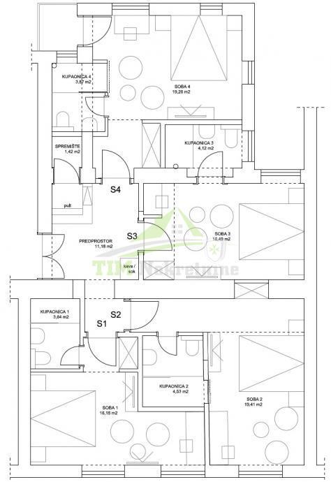 RASPORED:- predprostor- četiri sobe- četiri kupaonice sa WC-om- skladište- balkon