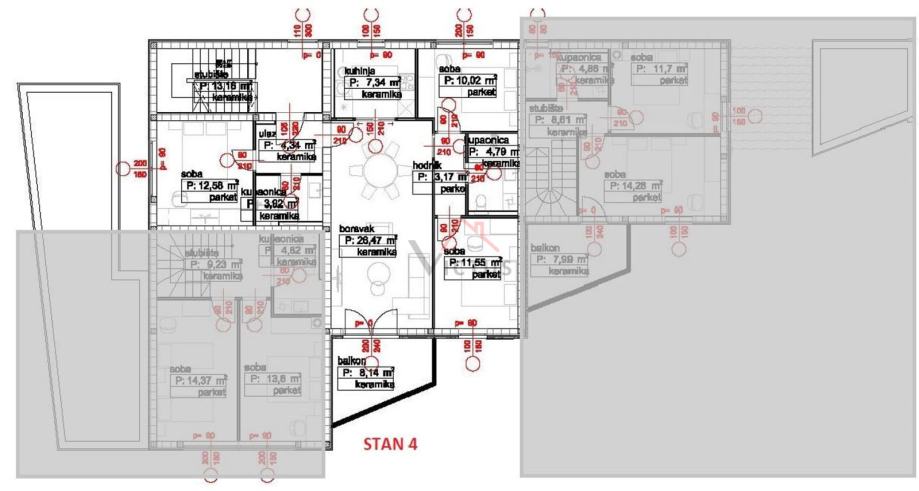 Neto površine 84 m2, sastoji se od hodnika, dnevnog boravka s kuhinjom i blagovaonicom, tri spavaće sobe i dvije kupaonice. Stanu također pripada balkon površine 8 m2, te parkirno mjesto. Mogućnost kupnje garaže površine 17 m2.