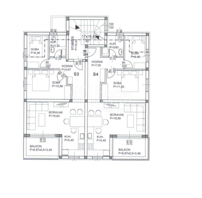blagovaonicom, dvije spavaće sobe, kupaonice i hodnika.