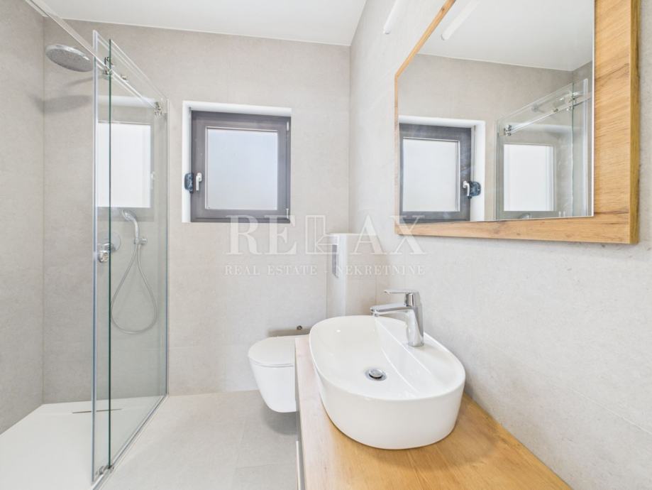 Stan je klimatiziran inverter klima uređajem, čime je osigurana ugodna temperatura tijekom cijele godine. Kupaonica je opremljena suvremenom sanitarnom opremom, tuš kabinom i pripremom za perilicu rublja.