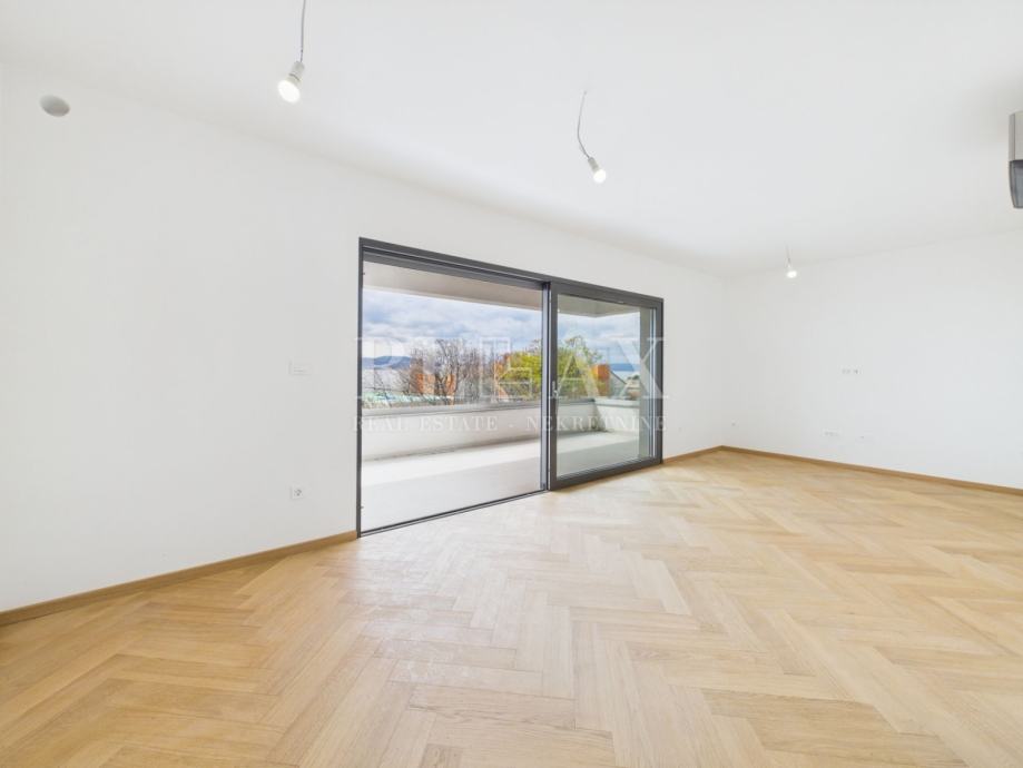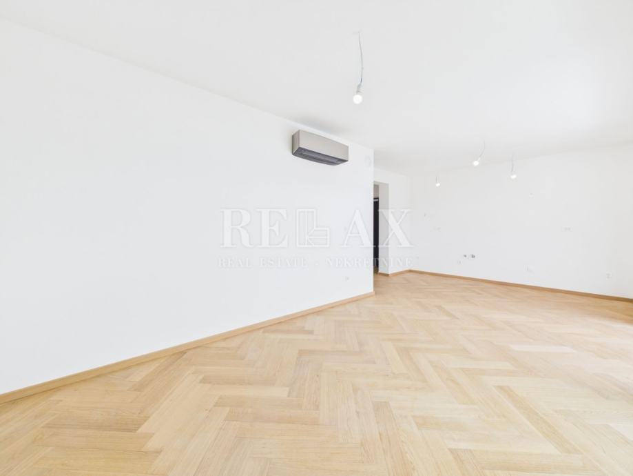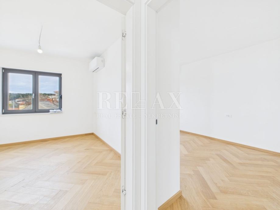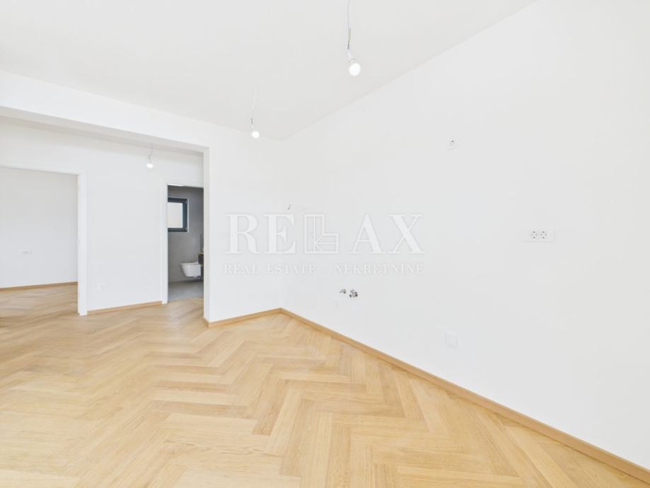 Interijer je izveden s naglaskom na kvalitetu i estetiku – podovi su obloženi parketom postavljenim u uzorku riblje kosti, a kupaonica i terasa opremljene su protukliznim keramičkim pločicama. Aluminijska vanjska stolarija s roletama, bijela lakirana unutarnja vrata, protuprovalna ulazna vrata i video-portafon s mogućnošću daljinskog otključavanja dodatno naglašavaju razinu sigurnosti i funkcionalnosti.