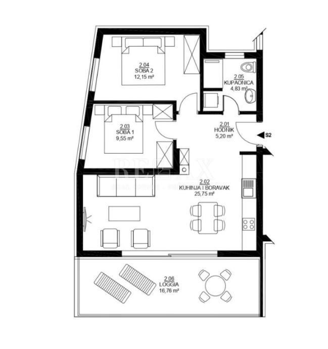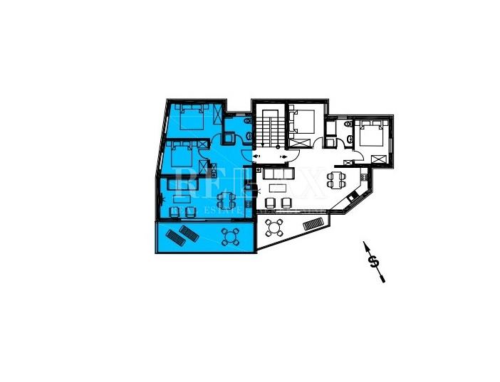 Stan se sastoji od prostranog dnevnog boravka s kuhinjom i blagovaonicom, dvije spavaće sobe te kupaonice. Velike staklene stijene povezuju dnevni prostor s prostranom natkrivenom terasom koja nudi predivan panoramski pogled na more i savršeno je mjesto za uživanje u ljetnim danima i večerima.