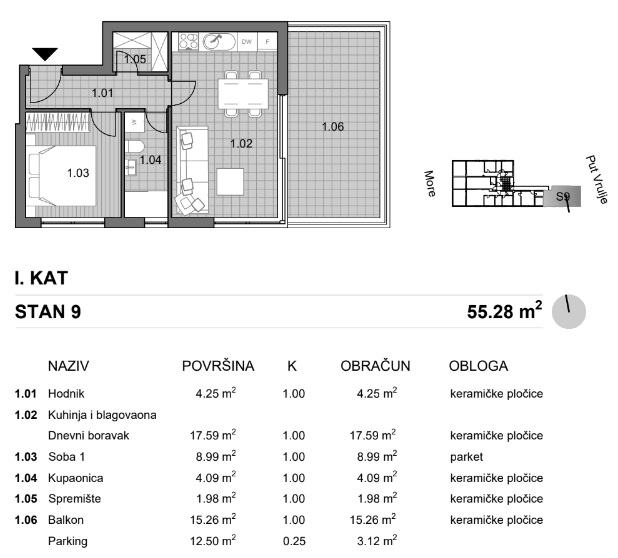 Prodaje se dvosobni apartman (S9) površine 55,28 m2 u novogradnji na izuzetnoj lokaciji u Povljani, 1. RED DO MORA!