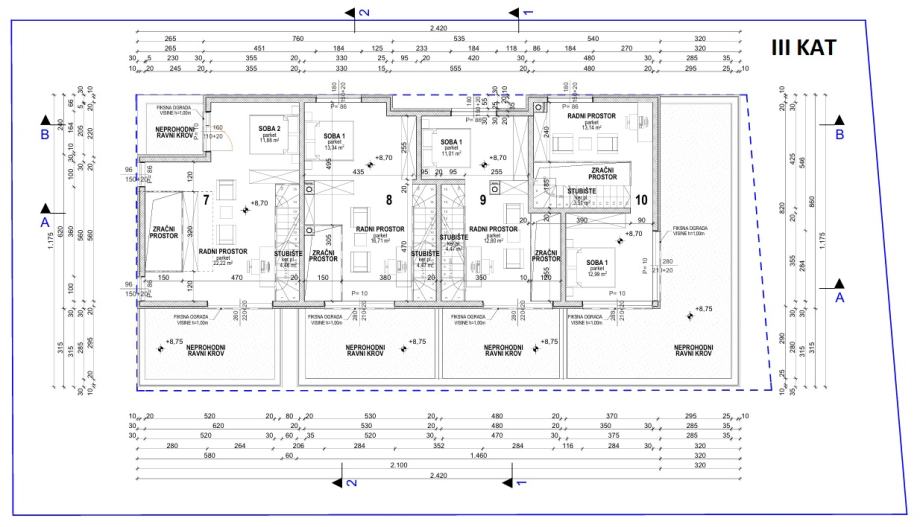 Na gornjoj etaži su 2 sobe, hodnik, stubište i velika krovna terasa površine 15,02 m2.