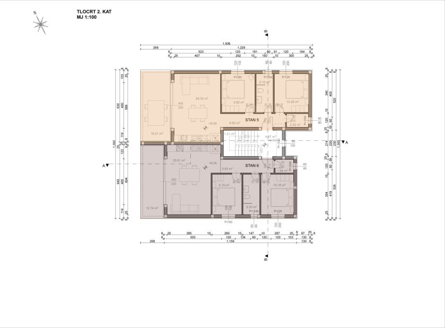 Zum Verkauf steht eine Dreizimmer-Penthouse-Wohnung mit schöner Aussicht, Im Grundriss mit S5 gekennzeichnet, braun gestrichen, mit einer Nettoberechnungsfläche von 70,05 m2, im 3. Obergeschoss eines hochwertigen Neubaus mit nur sechs Wohnungen, nahe dem Strand von St. Nikola in Povljana auf der Insel Pag.