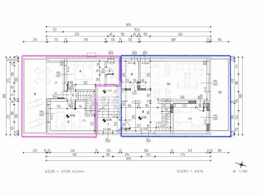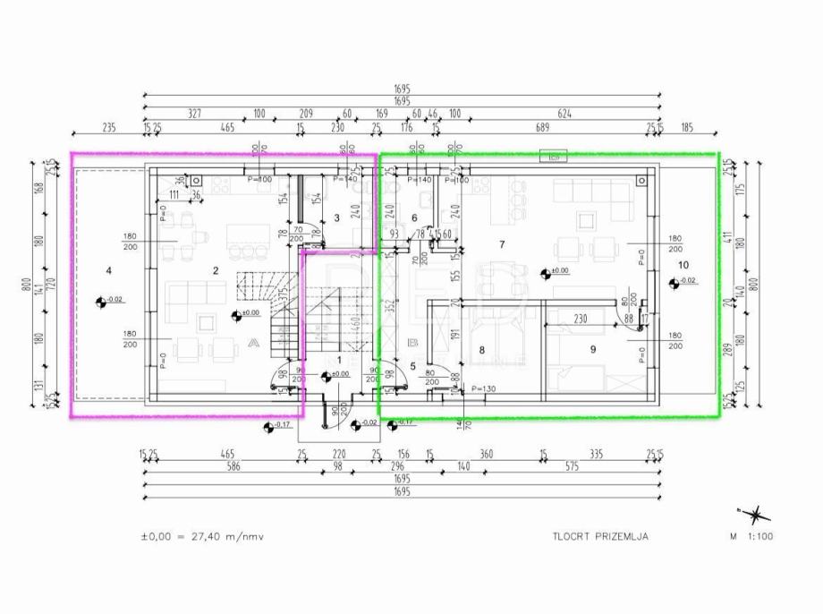 Prodaje se dvoetažni trosoban apartman (dvije spavaće sobe i dnevni boravak) koji se proteže kroz prizemlje i prvi kat, u tlocrtu označen ljubičastom bojom: