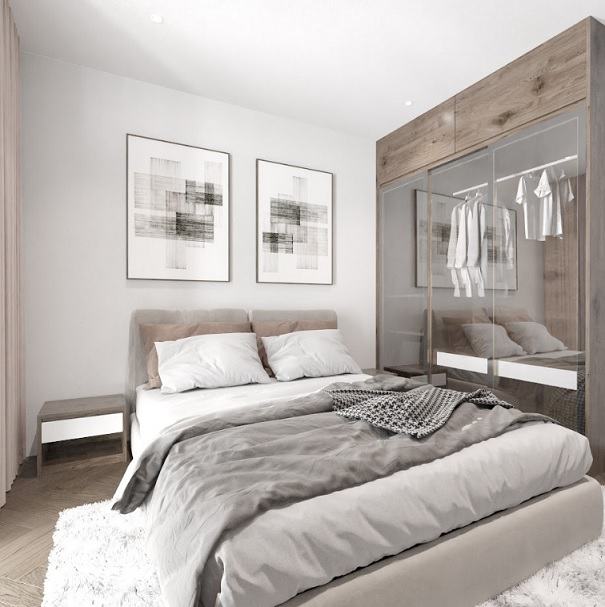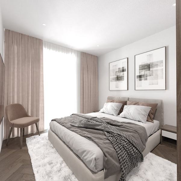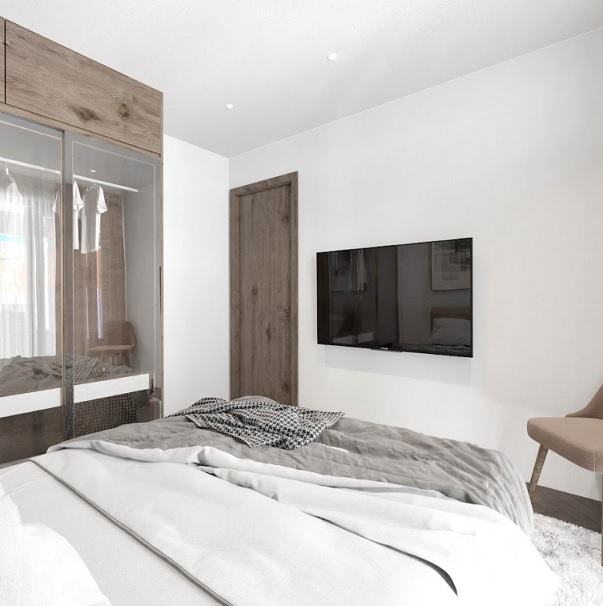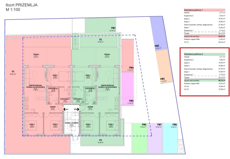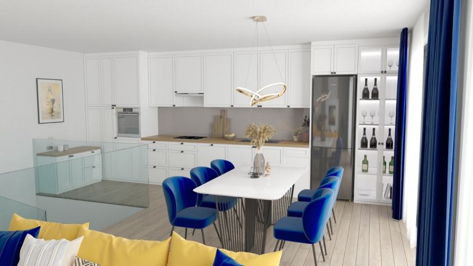 Sastoji se od 2 spavaće sobe, 2 kupaonice, 1 WC-a hodnika, dnevnog boravaka + kuhinje + blagovaone i balkona.