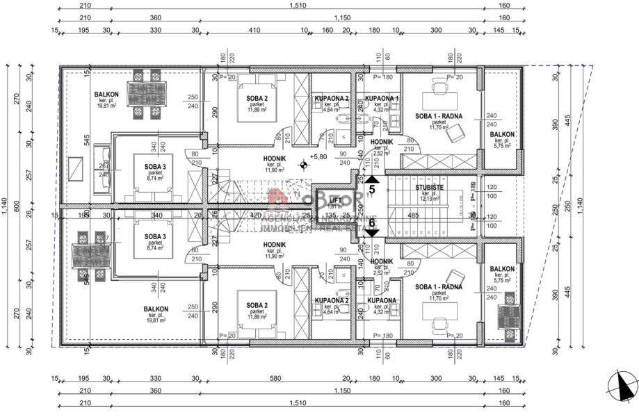 dva balkona (površine 5,08 m2 i površine 18,30 m2) na katu površine 55,04 m2.