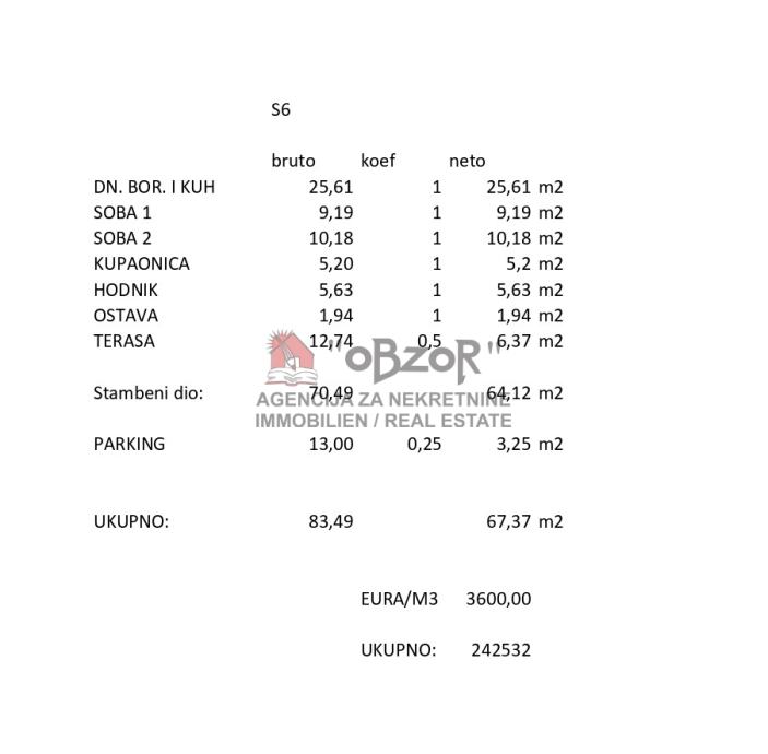Sveukupna bruto površina stana iznosi 83,49m2, a sveukupna neto površina stana iznosi 67,37m2.