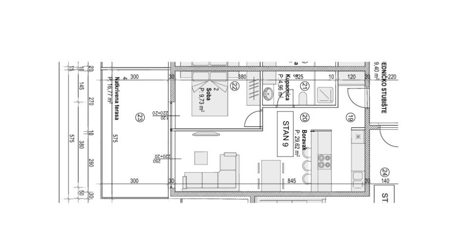 Stan se nalazi na prvom katu stambene zgrade s petnaest stambenih jedinica, oznake S9, i sastoji se od spavaće sobe, kupaonice, dnevnog boravka s kuhinjom i blagovaonicom te izlazom na natkrivenu terasu. Ukupna površina stana s terasom iznosi 61 m².