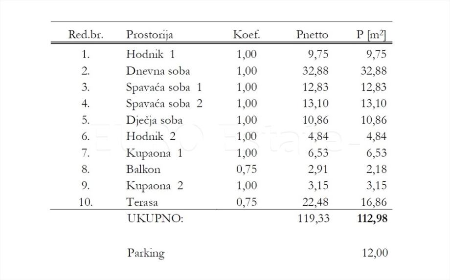 - ulazni hodnik, kupaona sa wc-om, kuhinja / blagovaona / dnevni boravak, terasa, predsoblje, 3 spavaće sobe, balkon,