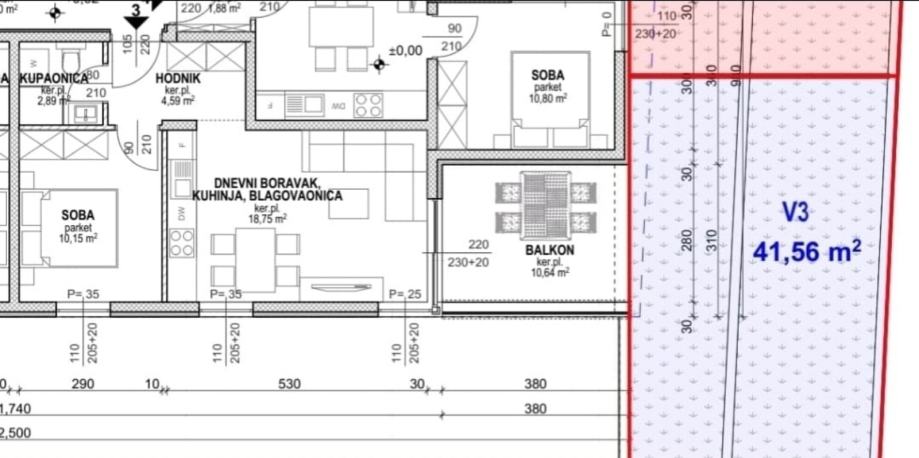 dnevnog boravka/blagovaone/kuhinje:18,75m2