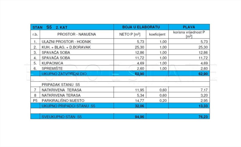 PROSTORIJE APARTMANA: vidjeti priloženi tlocrt (S 5, tlocrt plave boje) i popis prostorija sa površinama
