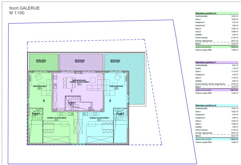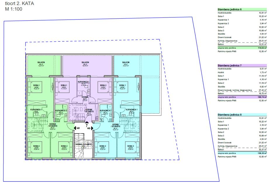2 spavaće sobe, hodnik, kupaona, dnevni boravak + kuhinja + blagovaona, balkon, parkirno mjesto
