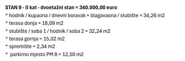 Propada mu i spremište u podrumu 2,34 m2 kao i parkirno mjesto PM8, površine 12,50 m2.