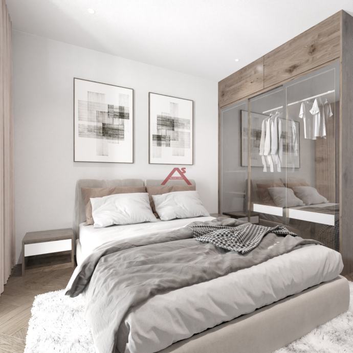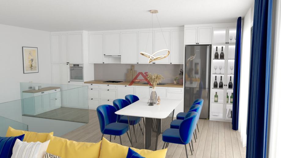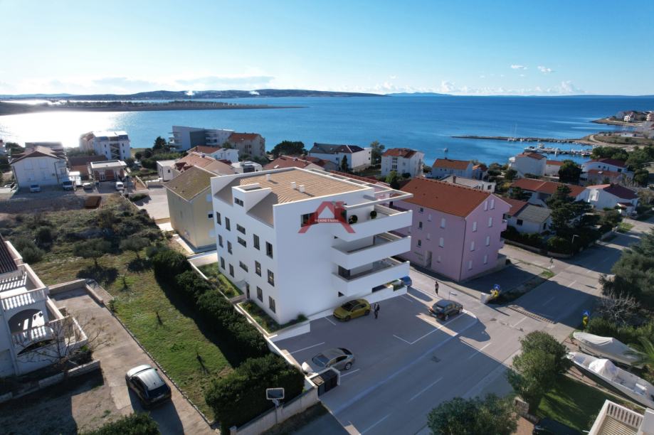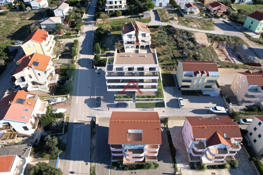 NOVOGRADNJA, dvoetažni stan ili apartman na drugom katu zgrade sa osam stanova. Planirani završetak objekta u lipnju 2025. godine. Stan se sastoji od: ulaznog hodnika, tri spavaće sobe (jedna sa balkonom), dvije kupaone te stubište za drugu etažu nakojoj se proteže prostrani dnevni boravak sa kuhinjom i blagovaonom povezanim sa prekrasnom terasom. Jedno parkirno mjesto u dvorištu zgrade. Zgrada na odličnoj lokaciji, 180 metara do mora, u blizini trgovina, kafića, restorana, ljekarne, šetnjice, teniskih terena itd. info na mob. 091 361 5081