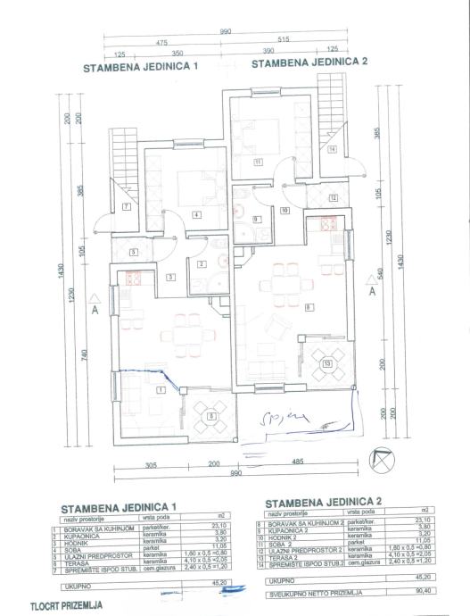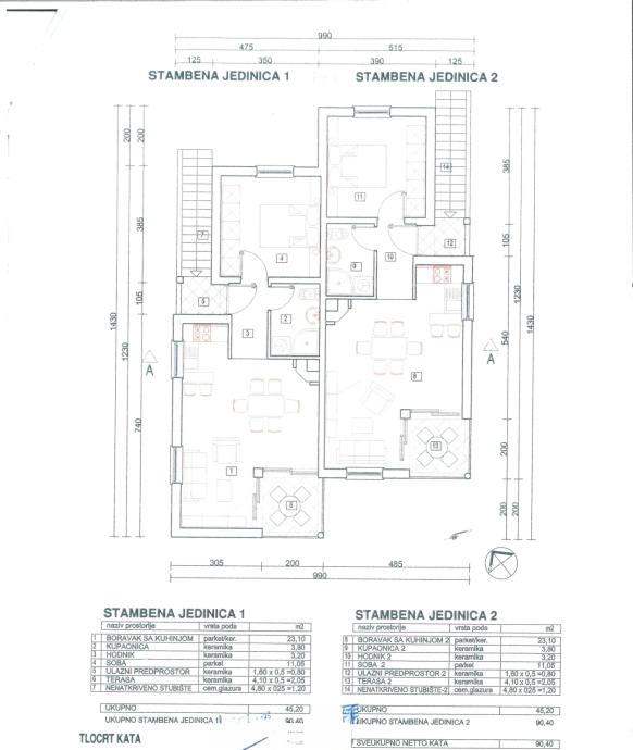 Apartmani u prizemlju su identični i svaki ima 45.20 m2.