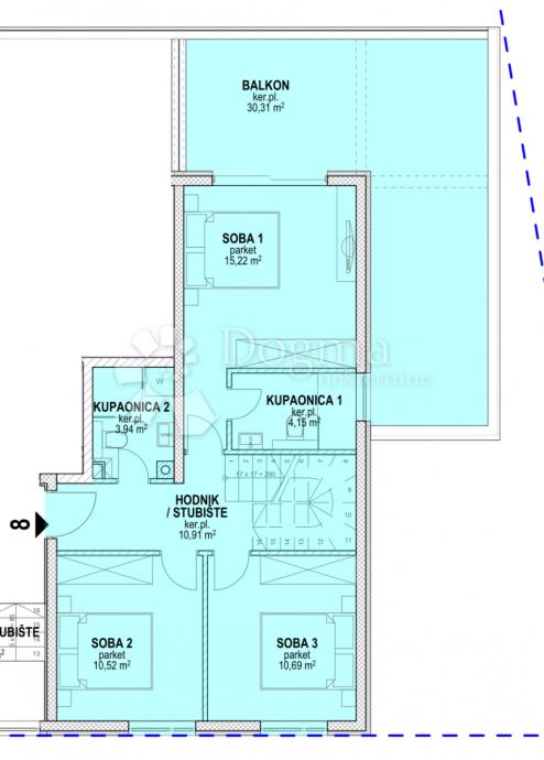 Na prodaju je dvoetažni stan S8 na 2. katu zgrade u novogradnji. Prolaskom kroz ulazna vrata stana, ulazi se u hodnik gdje se s desne strane nalaze 2 spavaće sobe, a s lijeve strane se nalazi kupaonica. Prolaskom pokraj kupaonice, s lijeve strane, nalazi se i treća, najveća spavaća soba površine 15.22m2 koja će imati i svoju vlastitu kupanicu. Ova soba će također imati vlastiti izlaz na ogromni balkon L oblika površine 30.31m2 što je i više nego dovoljno za uživanje na otvorenom u čistom zraku otoka Paga. Balkon će imati moderne, staklene ograde. Prolaskom ravno kroz hodnik, doalzi se do stubišta koje vodi na drugu etažu. Dolaskom na drugu etažu, ulazi se u prostranu kuhinju i blagavaonicu, gdje se s desne strane nalazi također prostrani dnevni boravak površine 21.02m2 s kojeg se pruža pogled na more i okolne otoke. Stan također ima i jedno osigurano parkirno mjesto.