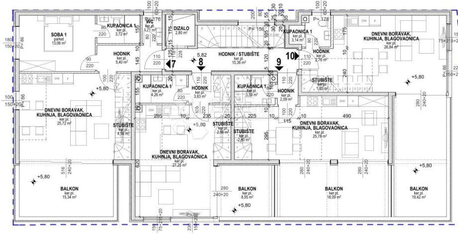 Na prodaju je dvoetažni stan na drugom katu zgrade u novogradnji. Prva etaža sastoji se od hodnika, stubišta, kupaonice te prostranog dnevnog boravka sa kuhinjom i blagavaonicom površine 25.78m2 koja nudi izlaz na balkon površine 18.09m2