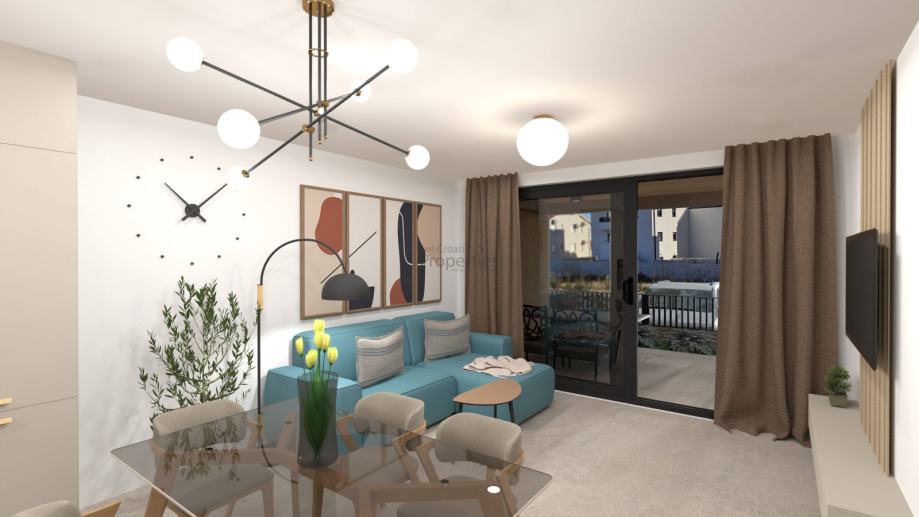 Na prodaju je moderno dizajniran dvosoban stan u prizemlju zgrade sa svega šest stambenih jedinica, smještene u mirnoj ulici novog naselja u Povljani, svega 350 metara od mora i prve plaže. Zgrada je u izgradnji i projektirana je za energetski razred A+, s vrhunskim standardima gradnje, termo, hidro i zvučne izolacije te suvremenim sustavima grijanja i hlađenja.
