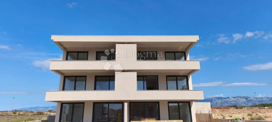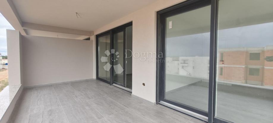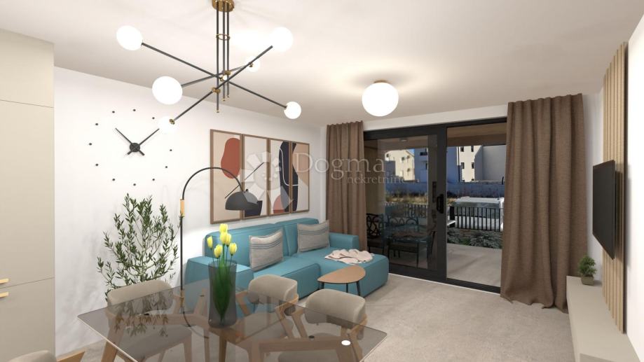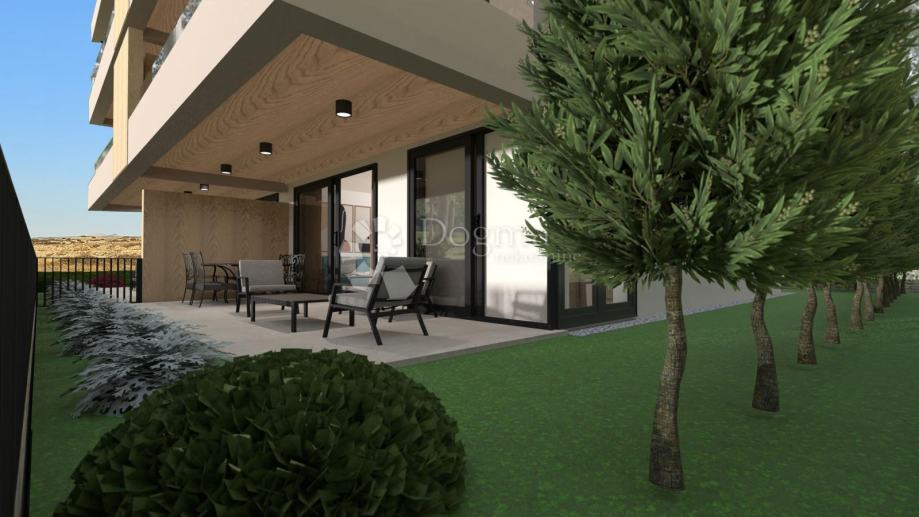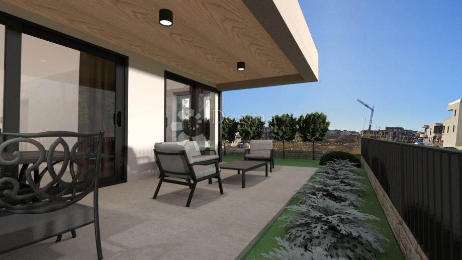 Na prodaju je moderno dizajniran stan na prvom katu u zgradi s ukupno 6 stanova, vrhunske kvalitete gradnje. Sastoji se od hodnika, WC-a, dvije spavaće sobe (jedna s izlazom na veliku terasu), kupaonice i prostranog dnevnog boravka s kuhinjom i blagovaonicom, koji također ima izlaz na terasu od 18.74 m² kroz kliznu staklenu stijenu. Stanu pripada i jedno osigurano parkirno mjesto.