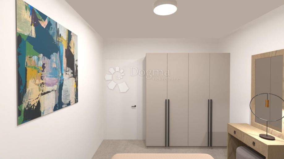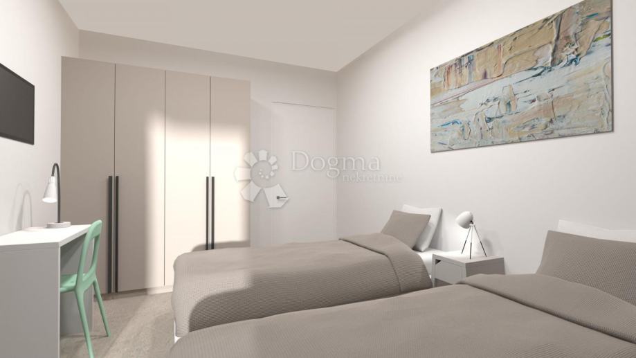 Na prodaju je moderno dizajniran stan na prvom katu u zgradi s ukupno 6 stanova, vrhunske kvalitete gradnje. Sastoji se od hodnika, WC-a, dvije spavaće sobe (jedna s izlazom na veliku terasu), kupaonice i prostranog dnevnog boravka s kuhinjom i blagovaonicom, koji također ima izlaz na terasu od 18.74 m² kroz kliznu staklenu stijenu. Stanu pripada i jedno osigurano parkirno mjesto.