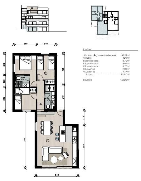Na prodaju je stan S1 u prizemlju zgrade u kompleksu dviju novih zgrada u Povljani, na otoku Pagu, ukupne površine 73.97m2. Stan se sastoji od prostranog dnevnog boravaka s blagovaonicom i kuhinjom. Desno od ulaznih vrata nalazi se nekoliko stepenica koje vode u hodnik gdje se nalazi kupaonica, te tri spavaće sobe, od kojih jedna ima vlastitu kupaonicu. Iz dnevnog boravka izlazi se na prostrano dvorište površine 153.20m2, savršeno za opuštanje i druženje.