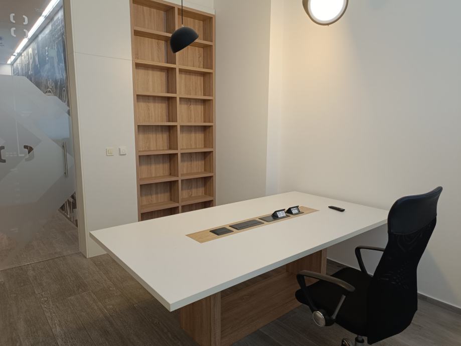 The office space has a modern design and is fully equipped. It consists of an entrance, hallway, large room with 9 workstations, office, toilet, bathroom with walk-in shower, kitchen equipped with refrigerator/freezer, dishwasher, 2 induction hobs, hood and microwave, and a break room. The office also contains a server cabinet, a hidden room with shelves and a fireproof safe, and has large cabinets with shelves for storing files, etc. that extends along the entire wall in the large room.