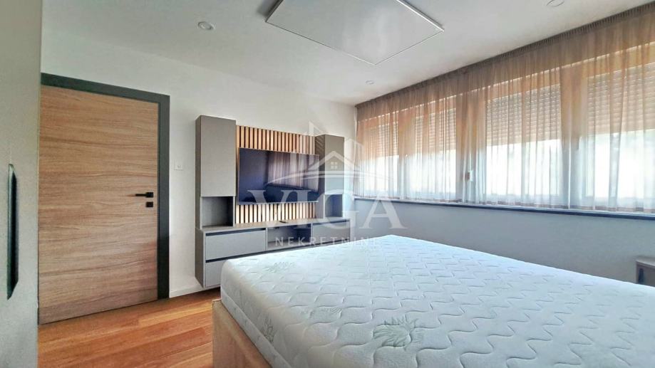 Stanom dominira prostrani open-space dnevni boravak koji se prirodno spaja s kuhinjom i blagovaonicom. Kuhinja, izrađena po mjeri od premium MDF materijala, opremljena je najnovijom serijom BOSCH aparata pod garancijom, dok dnevnu zonu definiraju Natuzzi kožni komadi namještaja i tehnologija posljednje generacije. Poseban arhitektonski detalj je dodatna soba nastala zatvaranjem loggie, odvojena elegantnim pomičnim stijenkama od kaljenog stakla, što prostoru daje dodatnu širinu i multifunkcionalnost.
