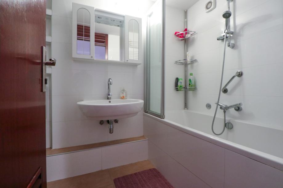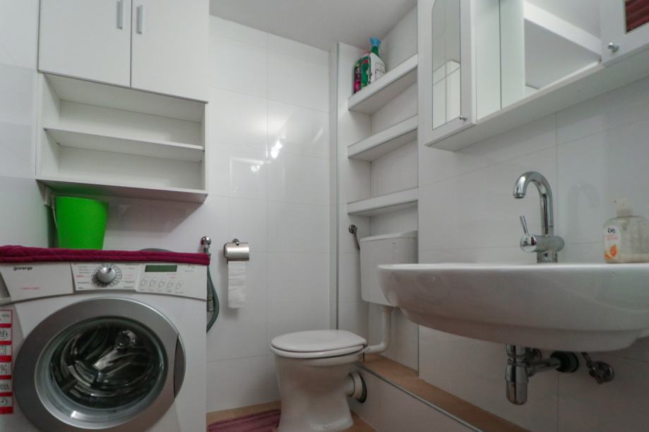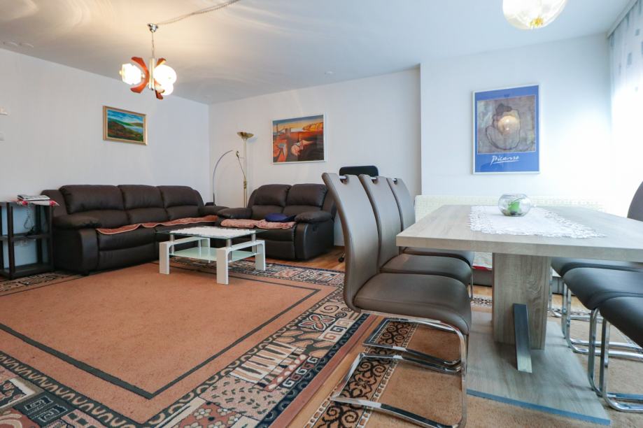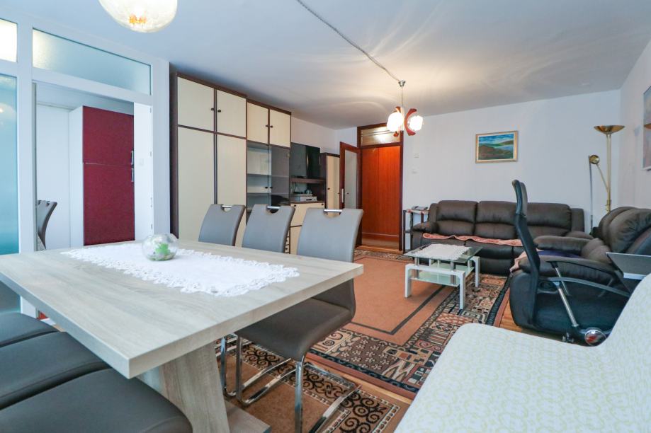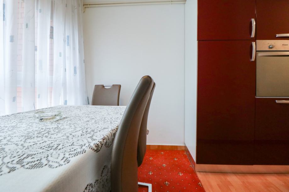 Potpuno je namješten i opremljen svim aparatima poput perilice posuđa, hladnjaka sa zamrzivačem, štednjakom, ugradbenom pećnicom, perilicom rublja, TVom, PVC stolarijom, protuprovalnim vratima i sl. Cijeli stan je renoviran 2020. godine (instalacije, podovi, pločice, zidovi, stolarija...).