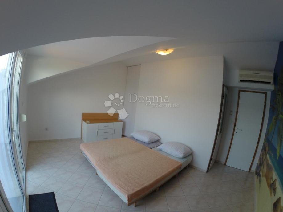 Na gornjoj etaži nalazi se još jedna spavaća soba i dječjom sobom sa pomoćnim ležajem, fitness soba sa jacuzzijom, tušom i instalacijom za saunu, terasom s vanjskim tušem i predivnim panoramskim pogledom na more.