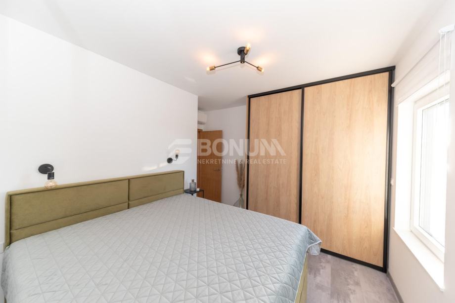 Stan je opremljen prema suvremenim standardima. Vrt je ograđen što osigurava privatnost, djelomično je popločan, dok je ostatak prekriven umjetnom travom i uređen kao ugodan vanjski prostor za boravak.