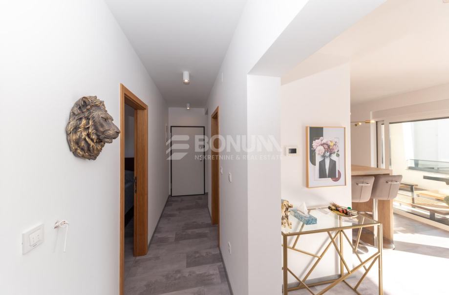 Ukupna neto stambena površina iznosi 119,47 m². Unutarnji prostor obuhvaća hodnik, dvije spavaće sobe, prostranu kuhinju povezanu s blagovaonicom i dnevnim boravkom, kupaonicu, zaseban WC te natkrivenu terasu ukupne površine 94,59 m². Uz stan dolazi spremište od 5,88 m² smješteno u suterenu zgrade, dva parkirna mjesta površine 13,30 m² i 13,10 m², kao i lijepo uređen vrt od 144 m².