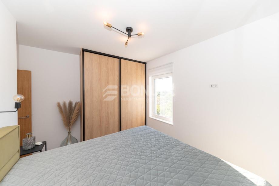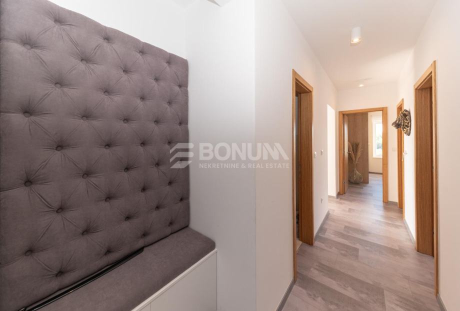Ukupna neto stambena površina iznosi 119,47 m². Unutarnji prostor obuhvaća hodnik, dvije spavaće sobe, prostranu kuhinju povezanu s blagovaonicom i dnevnim boravkom, kupaonicu, zaseban WC te natkrivenu terasu ukupne površine 94,59 m². Uz stan dolazi spremište od 5,88 m² smješteno u suterenu zgrade, dva parkirna mjesta površine 13,30 m² i 13,10 m², kao i lijepo uređen vrt od 144 m².