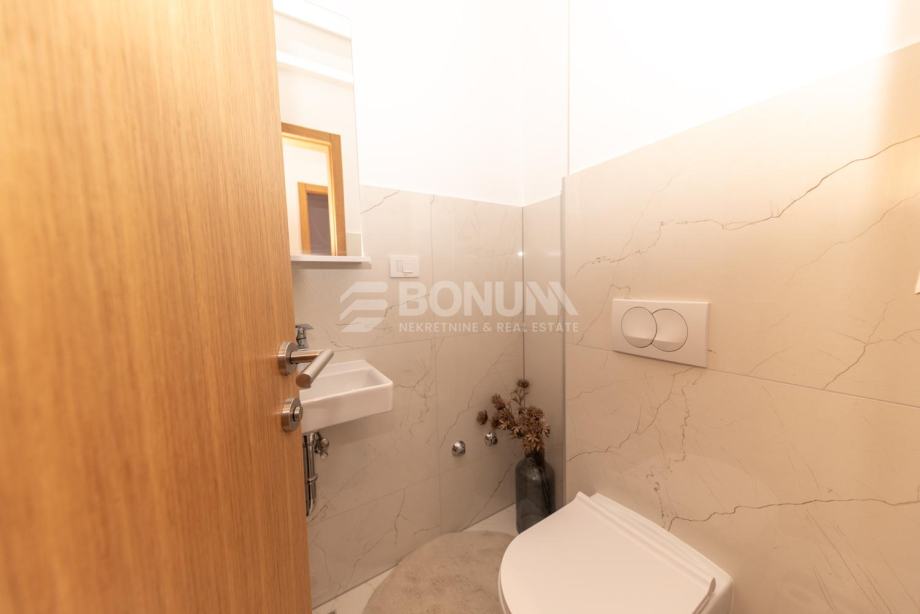 Stan je opremljen prema suvremenim standardima. Vrt je ograđen što osigurava privatnost, djelomično je popločan, dok je ostatak prekriven umjetnom travom i uređen kao ugodan vanjski prostor za boravak.