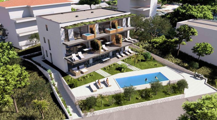 Na prvoj etaži nalazi se ulazni prostor, prostrana kuhinja s blagovaonicom i dnevnim boravkom, WC, garderoba te dva nenatkrivena balkona s očaravajućim pogledom na more. Unutarnjim stubištem dolazi se na drugu etažu, gdje se nalaze tri spavaće sobe, od kojih je jedna master soba s kupaonicom i garderobom, dodatna kupaonica i još jedan balkon.