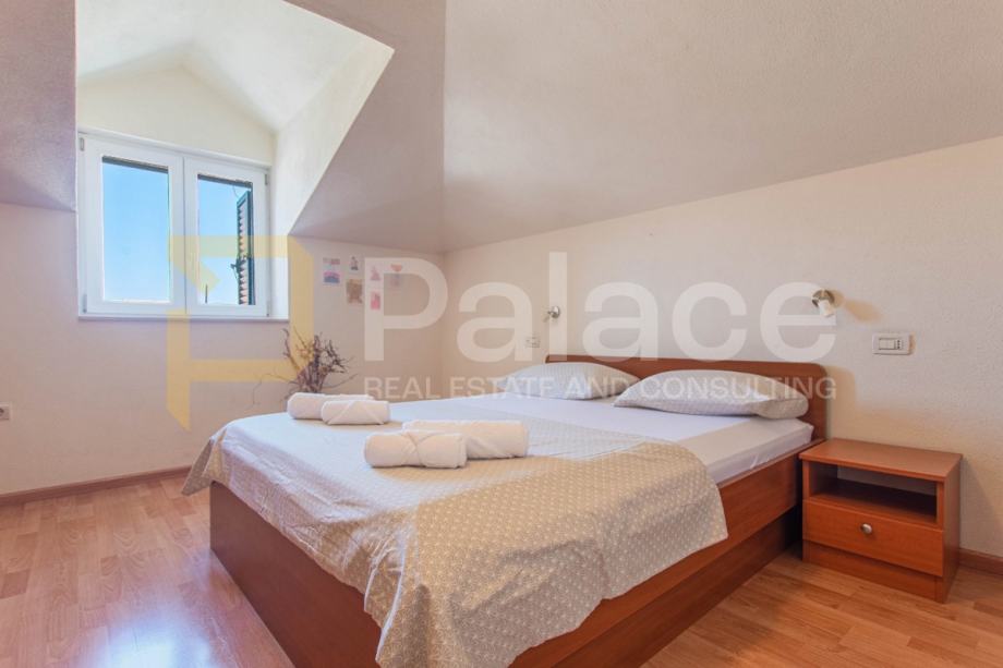 Sastoji se od tri spavaće sobe, kupaonice i wc-a, stubišta, prostrane kuhinje s blagovaonicom i dnevnim boravkom te velike terase s koje se prostire pogled na more i grad.