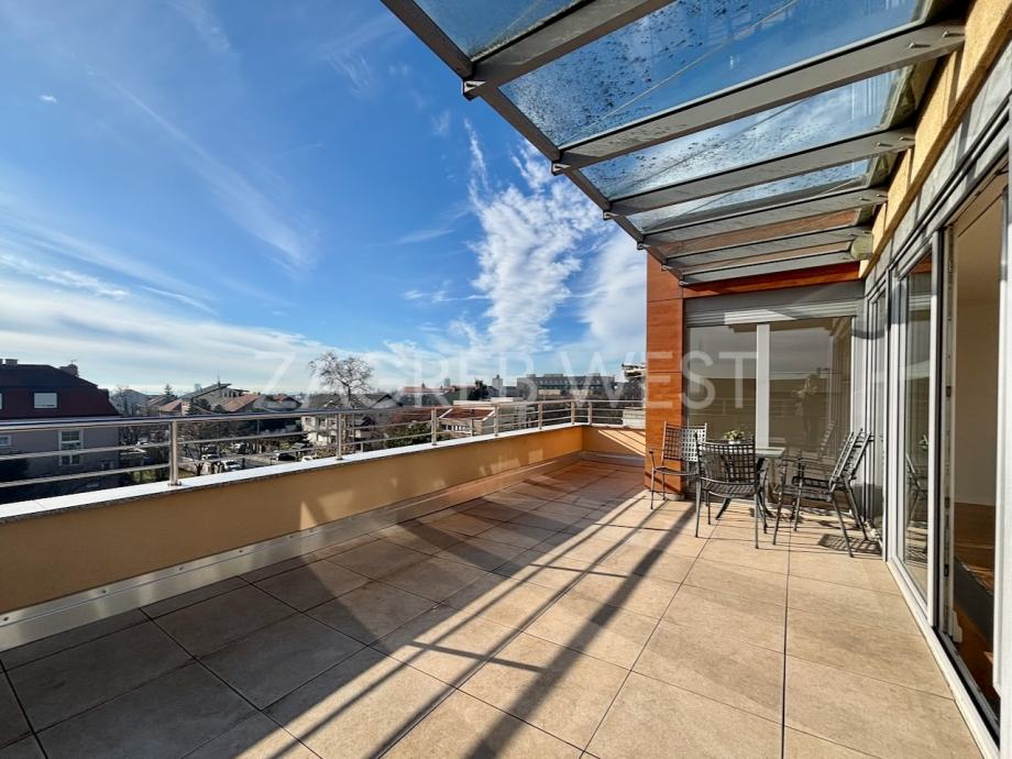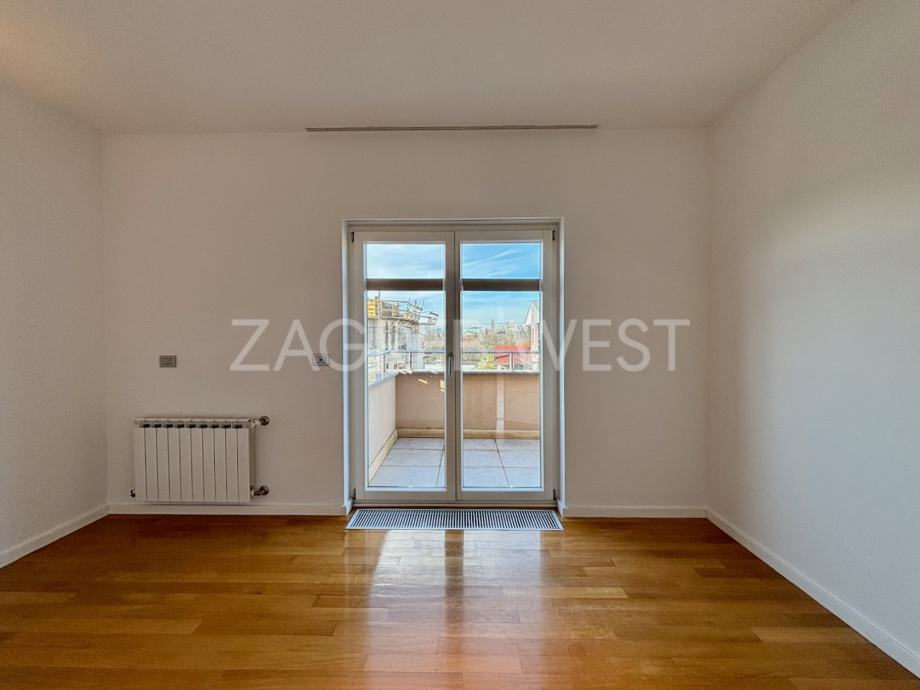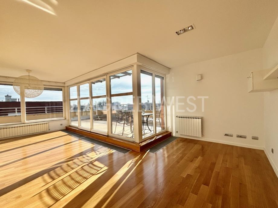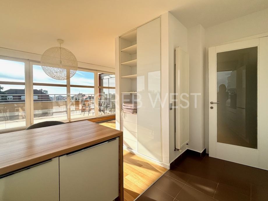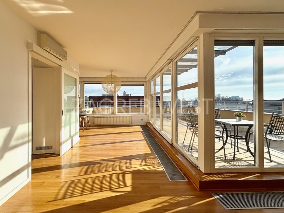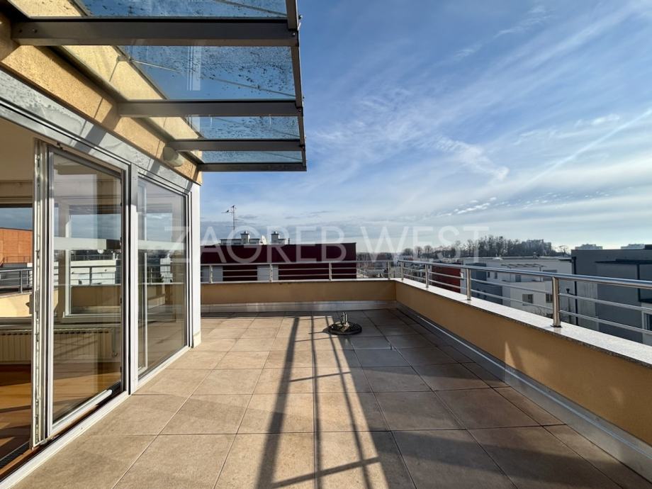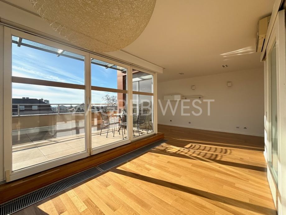Predivan, moderan penthouse odličnog rasporeda, u novijoj zgradi na top lokaciji. Sastoji se od prostranog dnevnog boravka s kuhinjom i blagovaonicom, koji izlaze na veliku terasu s koje se pruža otvoren pogled, tri spavaće sobe, od kojih dvije izlaze na balkon, kupaonice i gostinjskog wc-a. Dolazi s parkingom u garaži. Opremljen je s ugrađenim ormarima, kvalitetnom kuhinjom i sanitarijama, svim aparatima, klimom, električnim roletama, alarmom i videonadzorom. Pun je dnevnog svjetla.