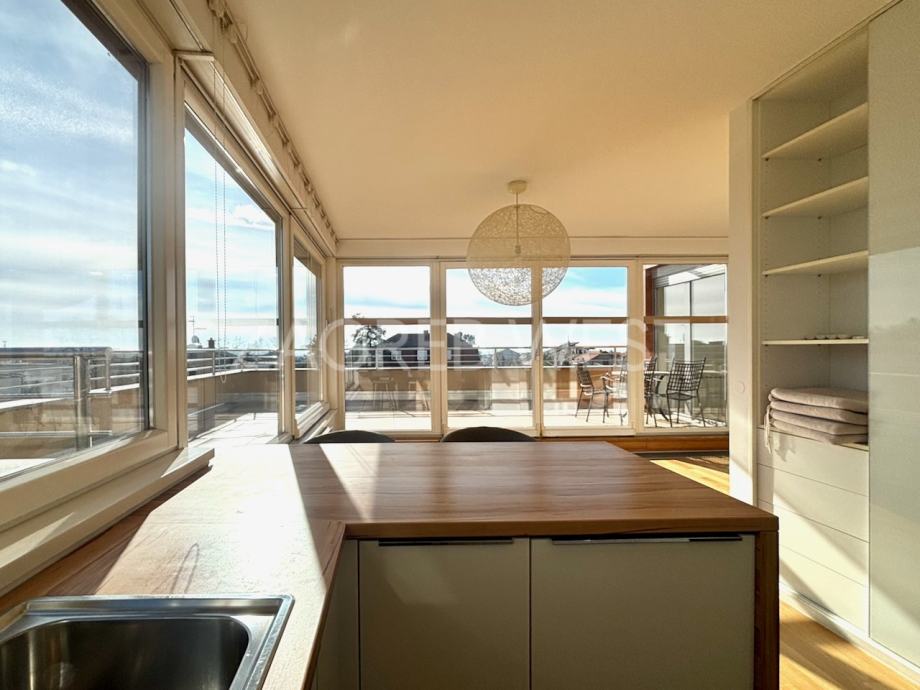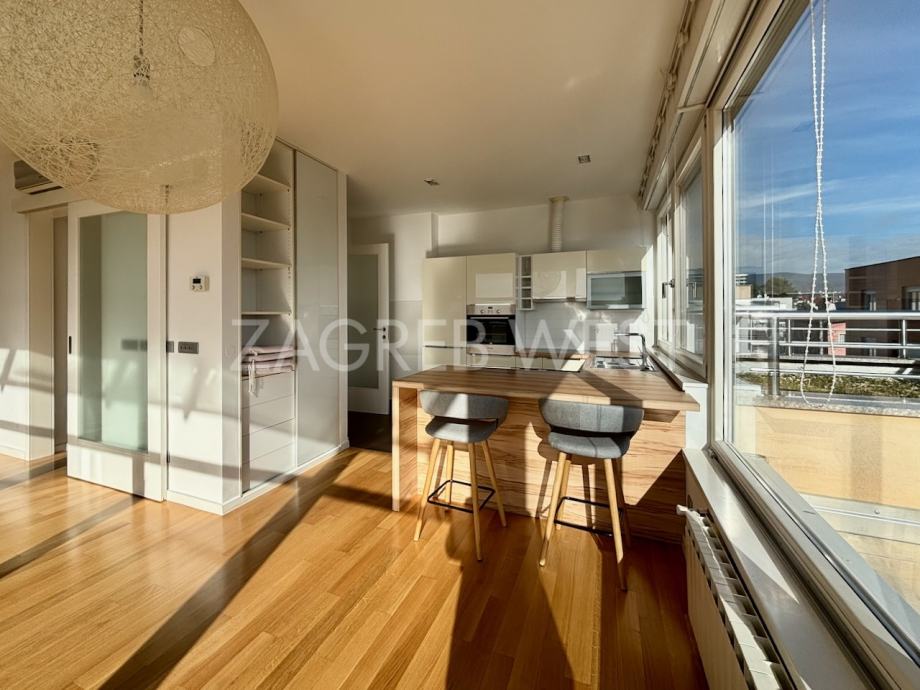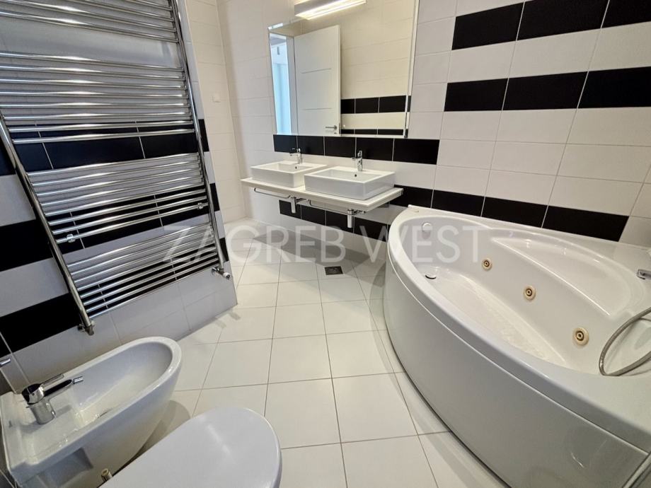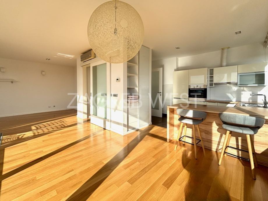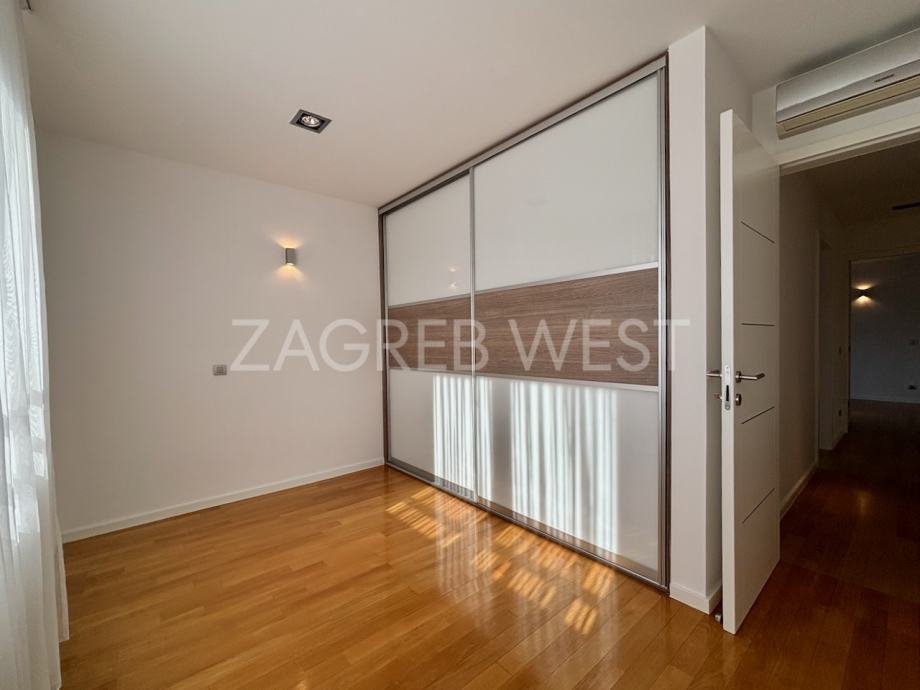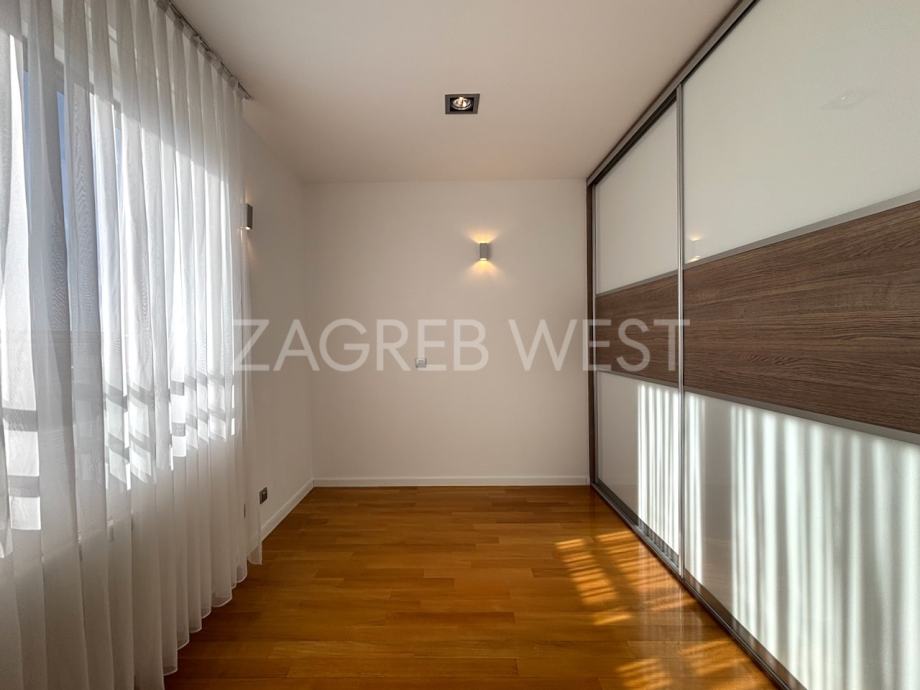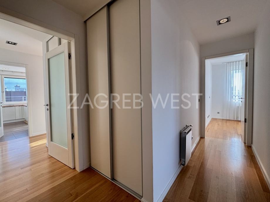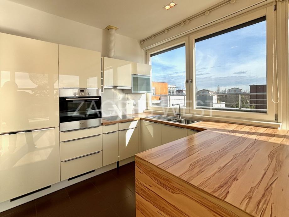 Predivan, moderan penthouse odličnog rasporeda, u novijoj zgradi na top lokaciji. Sastoji se od prostranog dnevnog boravka s kuhinjom i blagovaonicom, koji izlaze na veliku terasu s koje se pruža otvoren pogled, tri spavaće sobe, od kojih dvije izlaze na balkon, kupaonice i gostinjskog wc-a. Dolazi s parkingom u garaži. Opremljen je s ugrađenim ormarima, kvalitetnom kuhinjom i sanitarijama, svim aparatima, klimom, električnim roletama, alarmom i videonadzorom. Pun je dnevnog svjetla.