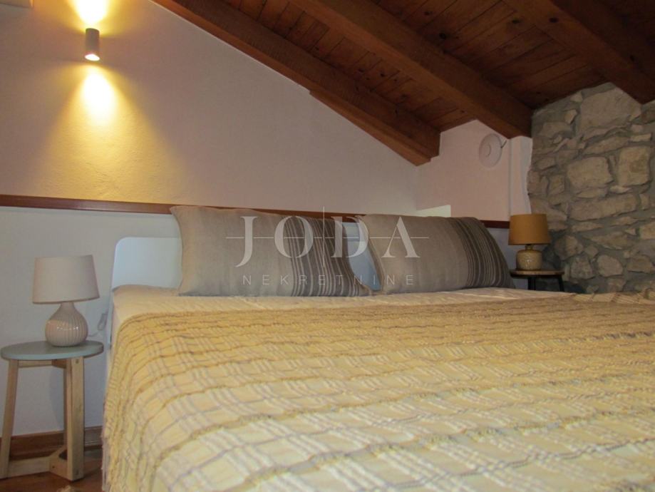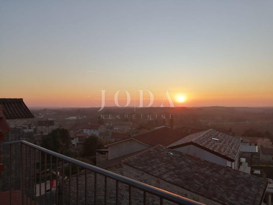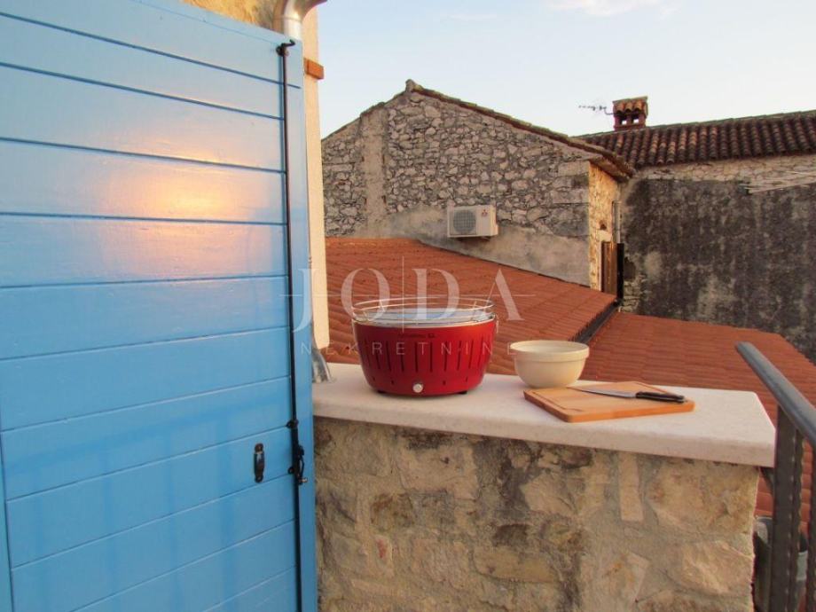 Stan se nalazi u tradicionalnoj Istarskoj kamenoj kući s romantičnim pogledom prema moru,divnim zalascima sunca i skrivenom terasom na krovu zgrade.Stan ima svoj privatni ulaz.Sastoji se od 2 spavaće sobe,2 kupaonice,potpuno opremljene kuhinje sa blagavaonom te dvije terase.