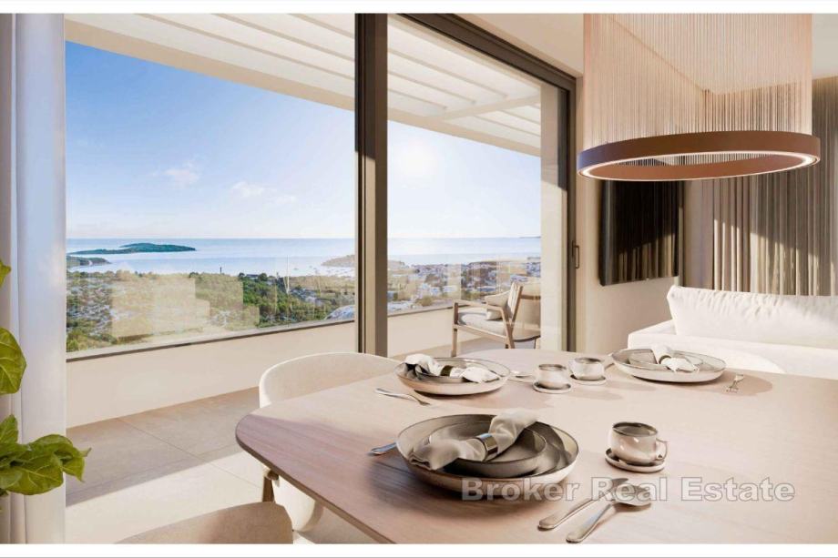 Unutrašnjost stana sastoji se od ulaznog hodnika, moderno opremljene kupaonice, dvije spavaće sobe, kuhinje te otvorenog koncepta dnevnog boravka s blagovaonicom. Iz dnevnog prostora omogućen je izlaz na lođu s koje se pruža pogled na more i grad.