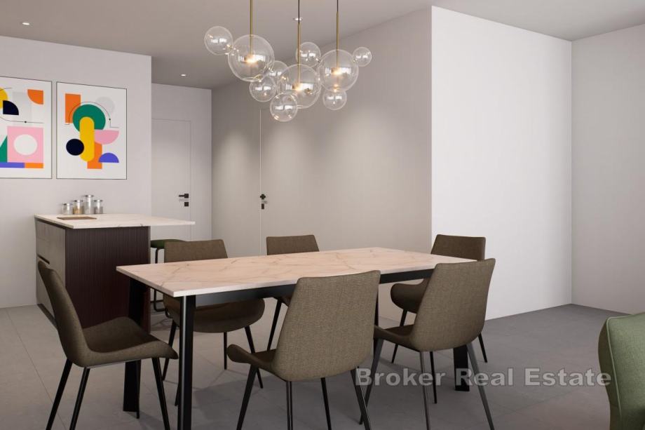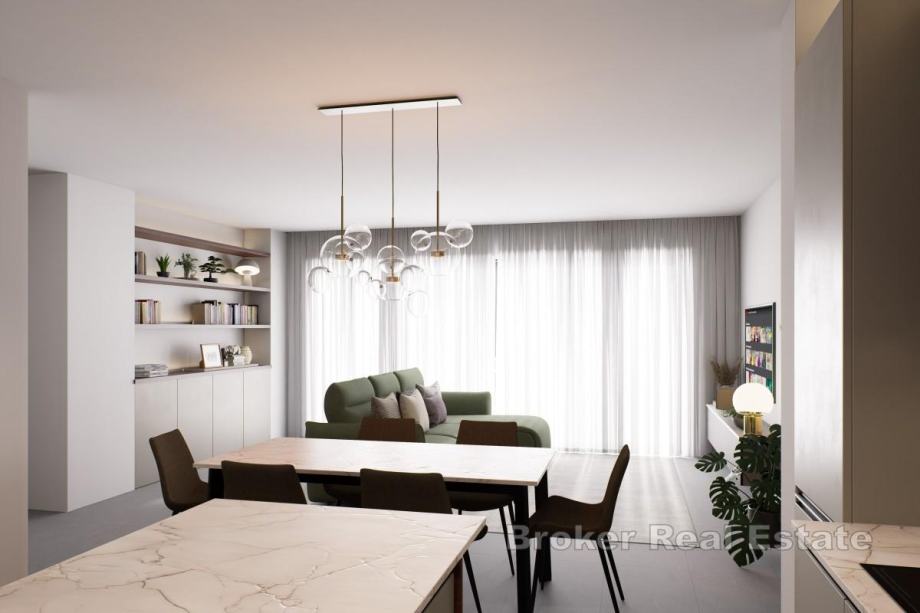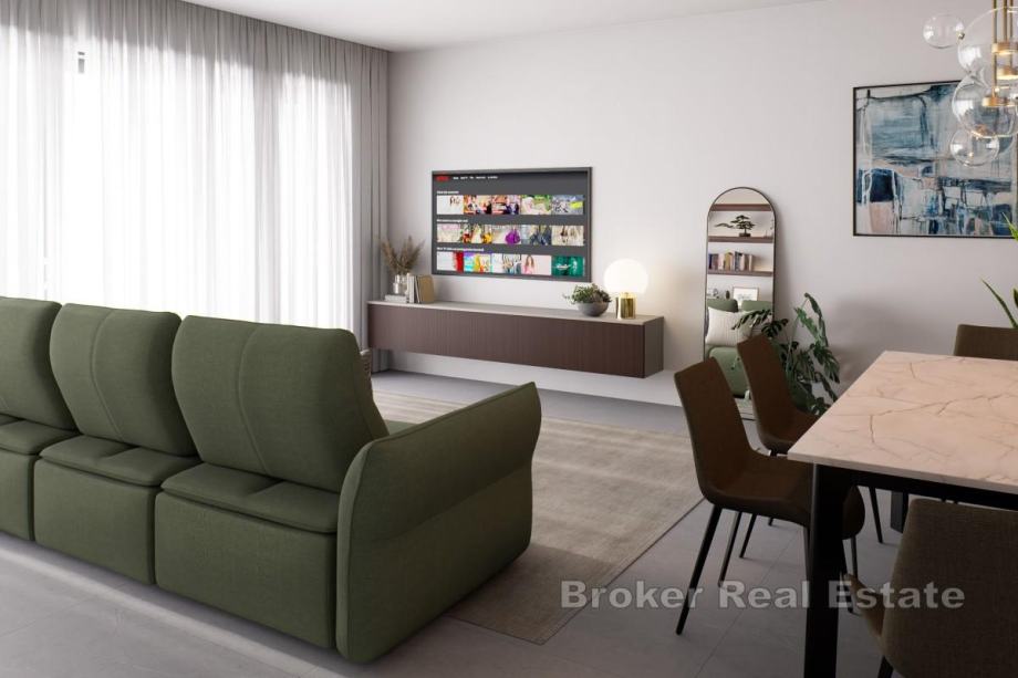 Vanjski prostor ovog stana posebno oduševljava: dvije terase ukupne površine 42 m² te privatni vrt od 89 m², savršen za mediteranski način života, opuštanje i obiteljska okupljanja.