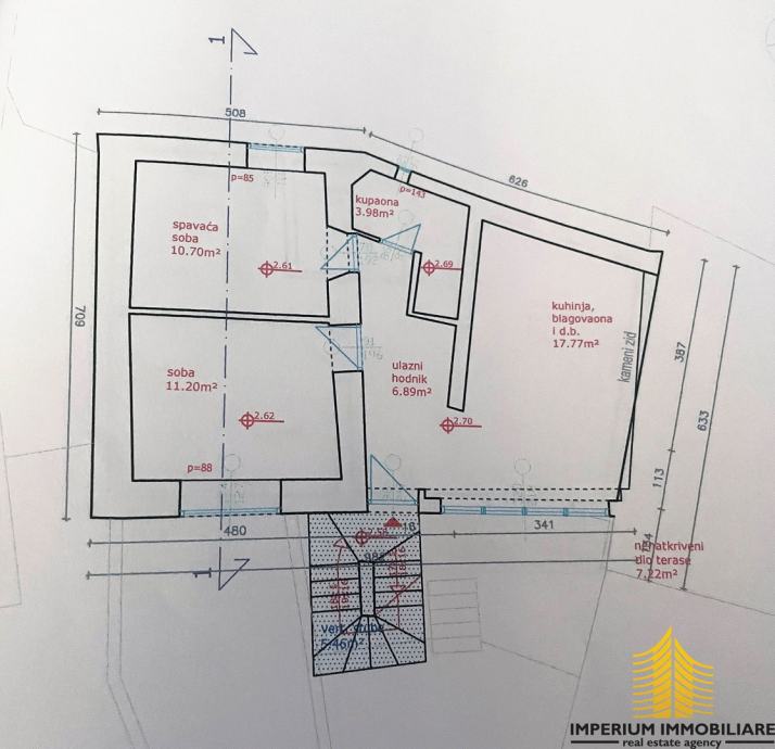 Stan se nalazi na 1. katu od ukupno 2 kata i sastoji se od ulaznog dijela, kuhinje, blagovaone, dnevnog boravka, 2 spavaće sobe i kupaone.