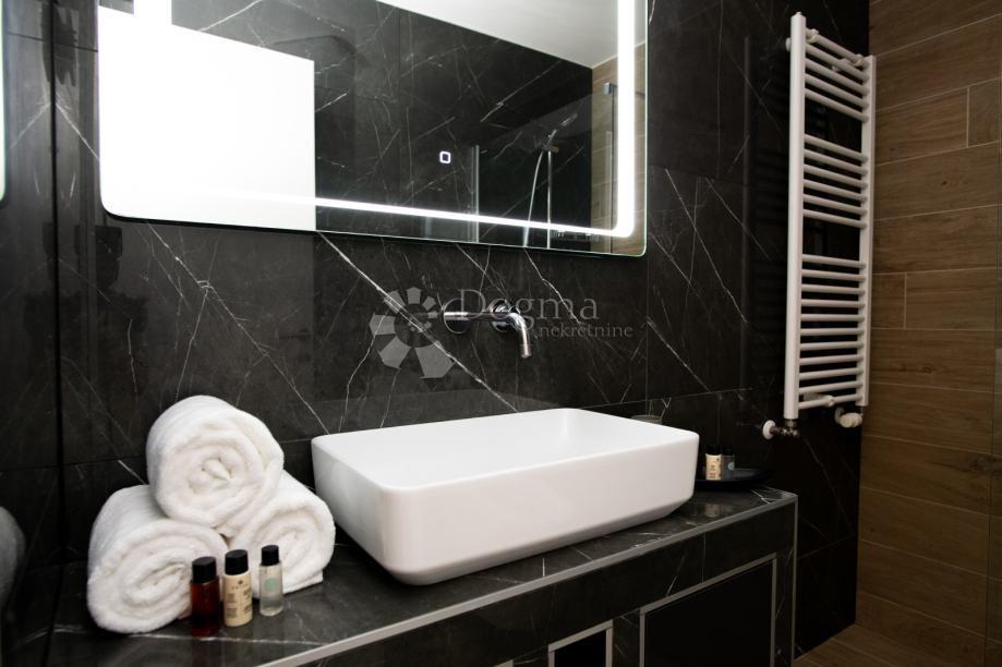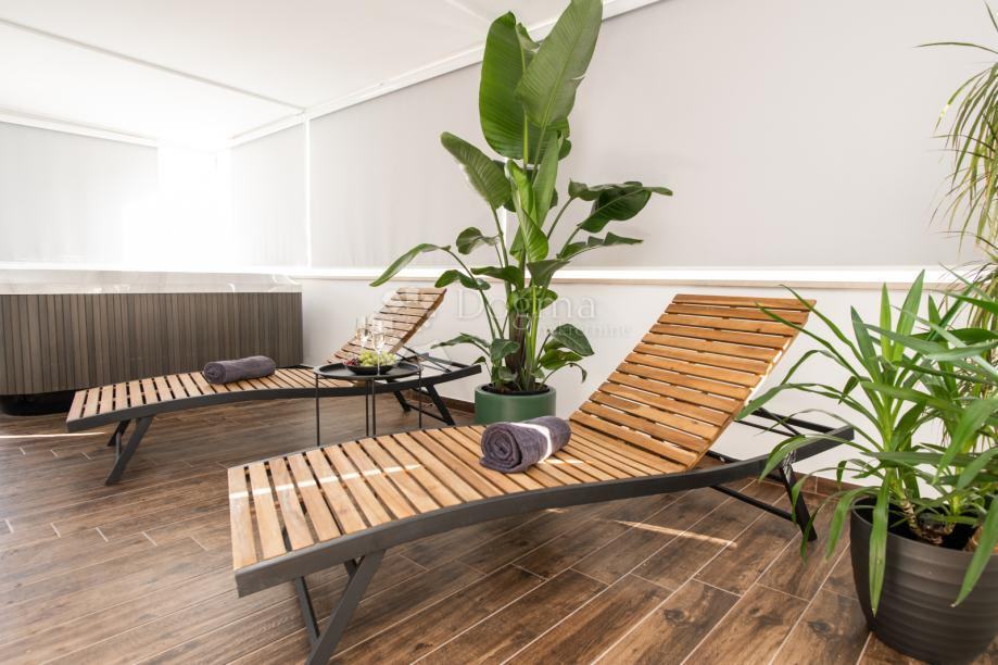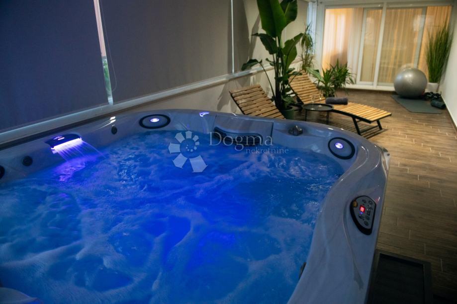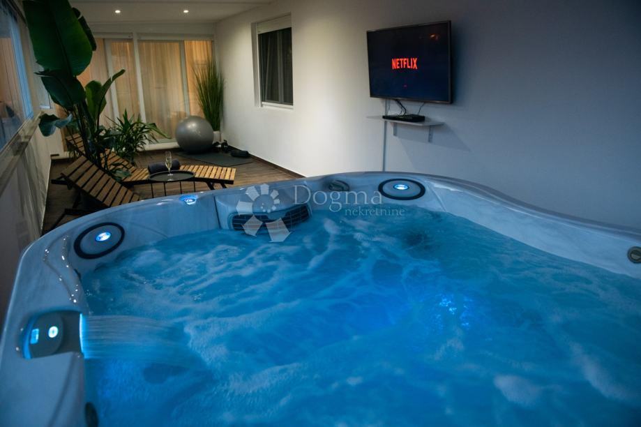 Posebnost ovog stana je velika terasa na kojoj se nalazi Jacuzzi® , idealan za opuštanje i uživanje u slobodnom vremenu. Sav namještaj je rađen po mjeri od visokokvalitetnih materijala, čime je svaki kutak stana pametno iskorišten, pružajući maksimalnu funkcionalnost i estetiku.